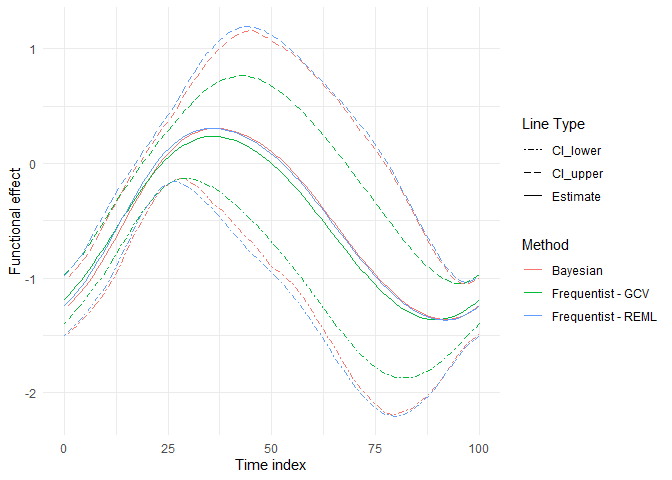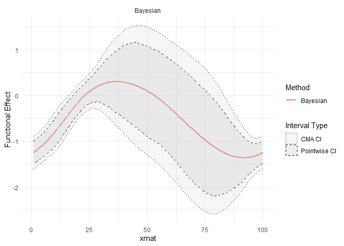refundBayes_SoFR = refundBayes::sofr_bayes(y ~ X1+s(tmat, by=lmat*wmat, bs="cc", k=10),